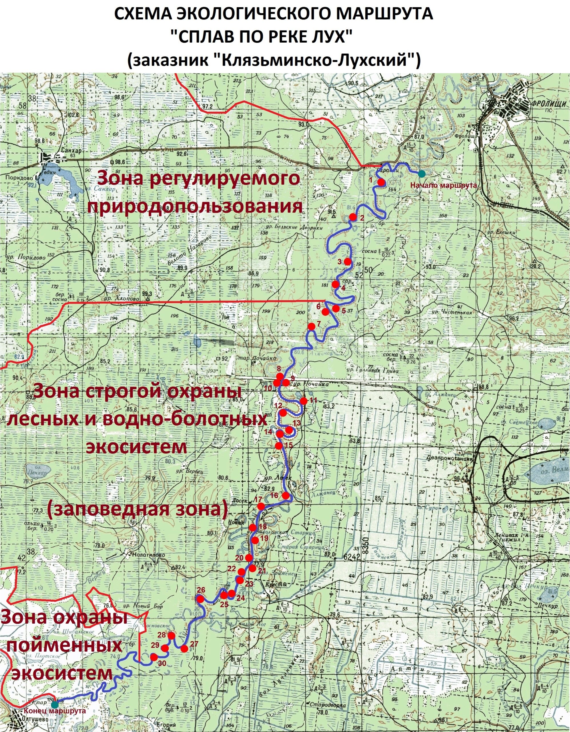 Через 2 км от начала маршрута туристы пересекают границу Клязьминско-Лухского заказника. На правом берегу за деревьями проходит дорога, вымощенная бетонными плитами. Здесь на страже границ особо охраняемой природной территории, стоит лесной кордон Гороховецкого военного лесничества.