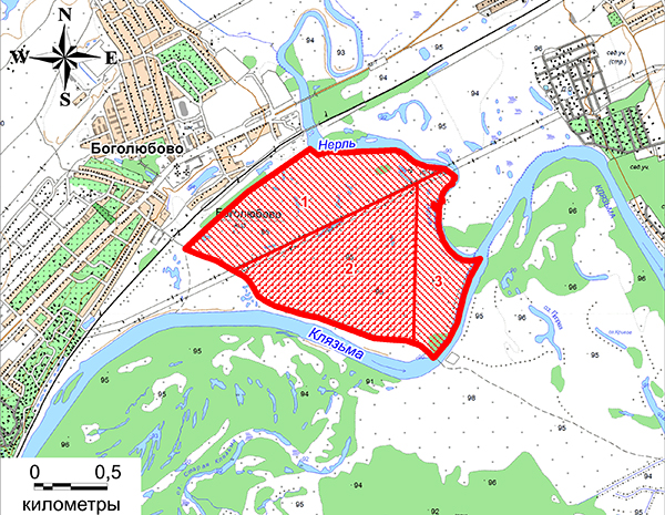 Суздальский район, юго-восточнее пос. Боголюбово, в месте впадения р. Нерль в р. Клязьму; на землях сельскохозяйственного назначения.
