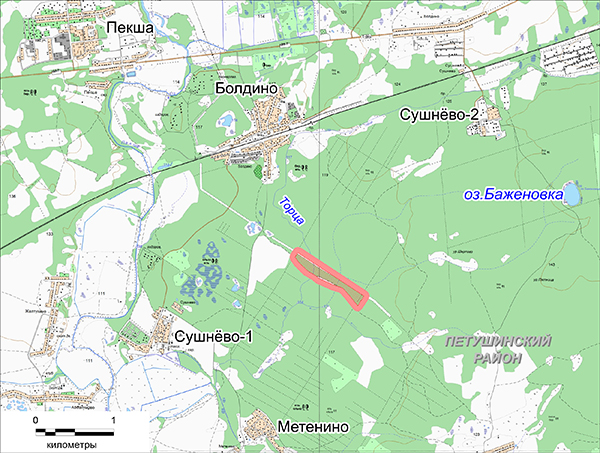 Петушинский район, 1 км юго-восточнее пос. Болдино; на землях лесного фонда Заречного лесничества (Болдинское участковое лесничество, части кв. 102).