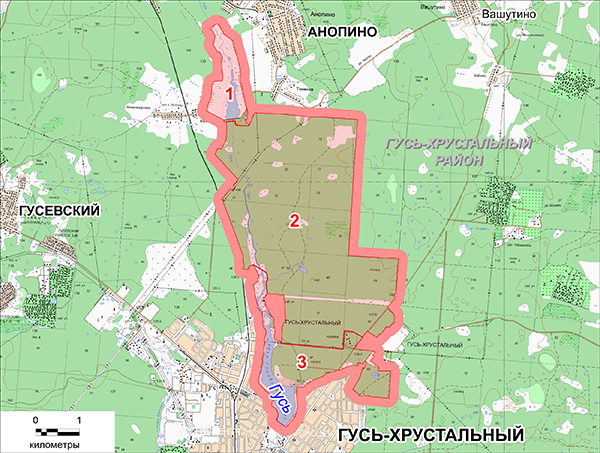 Гусь-Хрустальный район, к северу от г. Гусь-Хрустальный вдоль р. Гусь; на землях лесного фонда Гусевского лесничества, землях сельскохозяйственного назначения, землях населённых пунктов и землях водного фонда.
