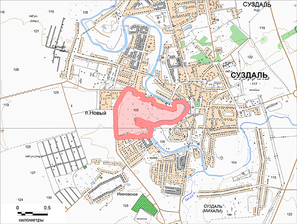 Суздальский район, западная часть г. Суздаль, правобережная пойма р. Каменка; на землях населённых пунктов.