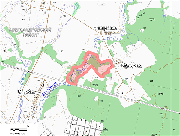 Александровский район, к западу от д. Каблуково; на землях лесного фонда Александровского лесничества, землях сельскохозяйственного назначения и землях водного фонда.