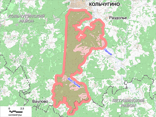Кольчугинский район, на юг от г. Кольчугино до границы с Петушинским районом; на землях лесного фонда Кольчугинского лесничества, землях сельскохозяйственного назначения и землях населённых пунктов.