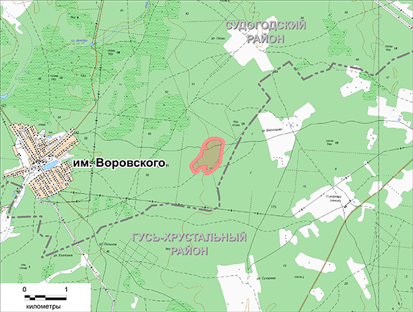 Судогодский район, 3 км восточнее пос. им. Воровского; на землях лесного фонда Андреевского лесничества (Воровское участковое лесничество, кв. 61).